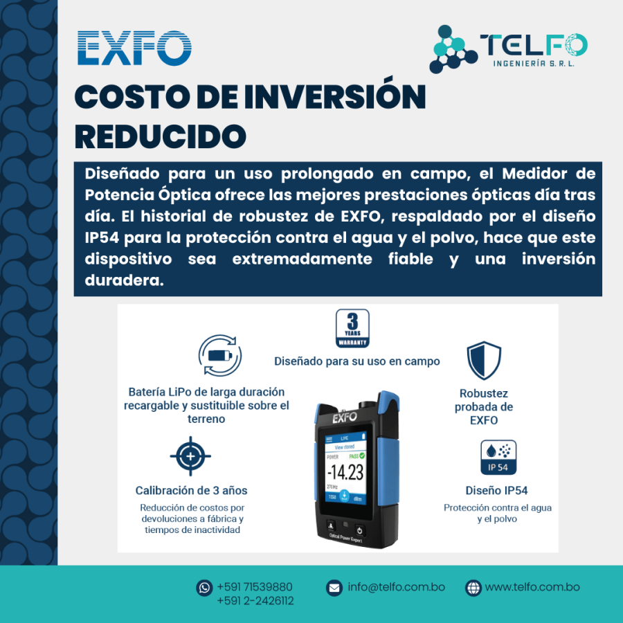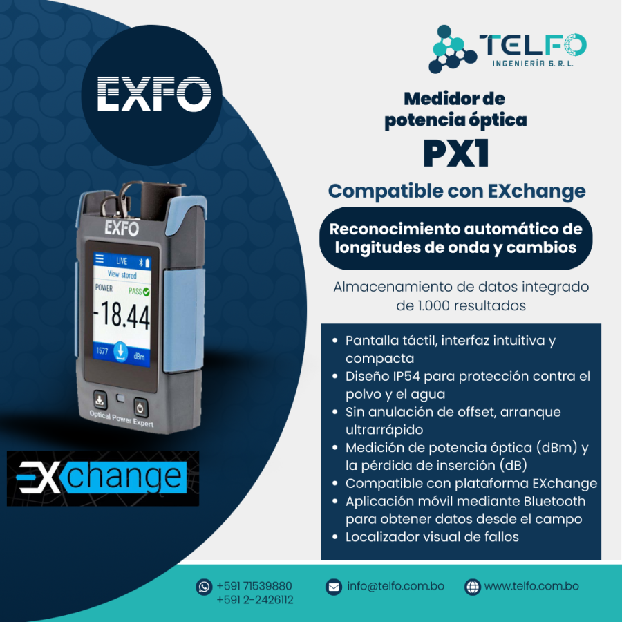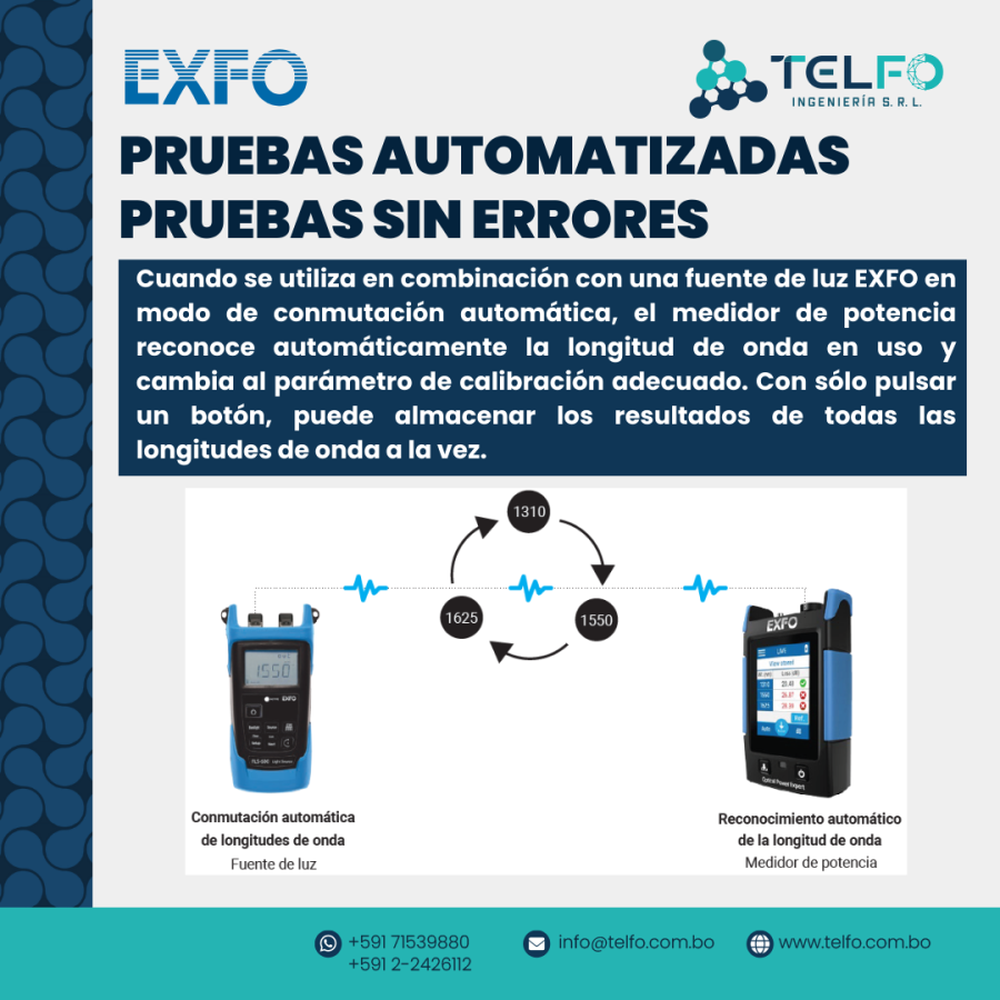El Medidor de Potencia Óptica EXFO ofrece mediciones precisas en una amplia gama de longitudes de onda y potencias. Su diseño robusto, pantalla táctil y capacidades avanzadas, como la conectividad Bluetooth y la generación de informes en tiempo real, optimizan la eficiencia del trabajo de campo. Ideal para técnicos que requieren fiabilidad, rapidez y precisión, todo en un solo dispositivo compacto.