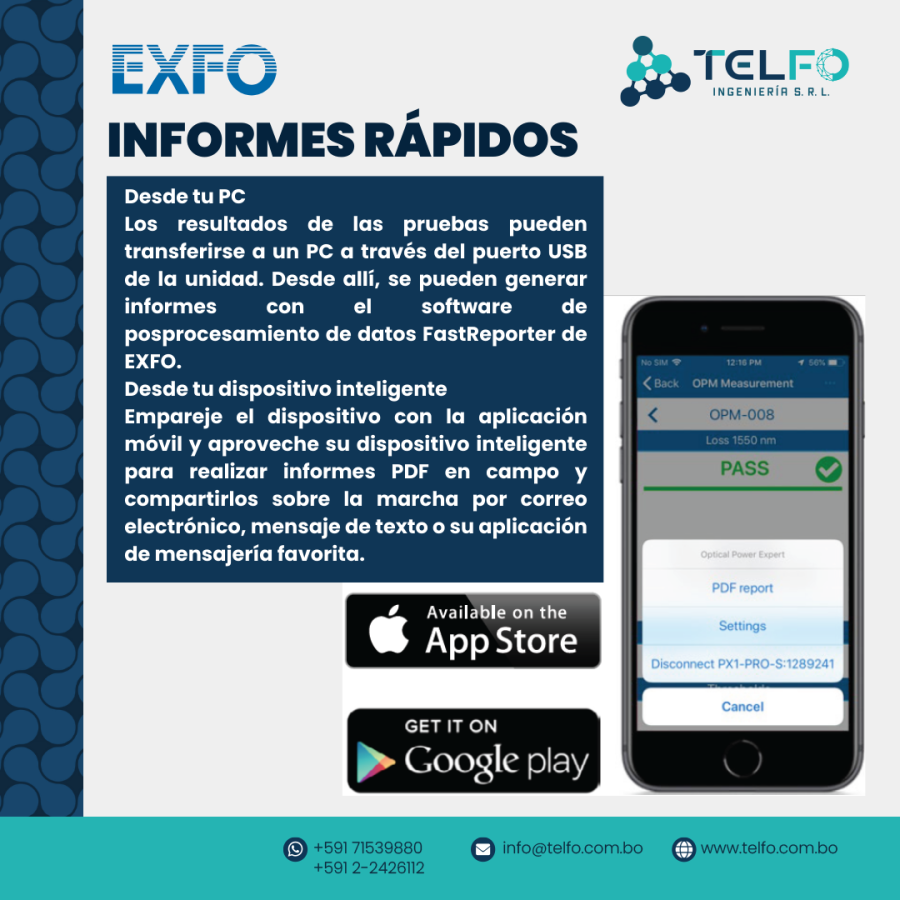 Informes | Dos métodos disponibles: • Conecte la PX1 a un smartphone mediante Bluetooth. Genera y comparte informes en PDF mediante la aplicación EXFO. • Transfiera los resultados a un PC mediante un cable USB y genere informes con el software FastReporter. |